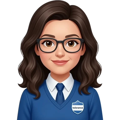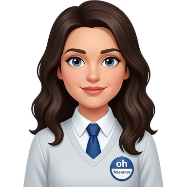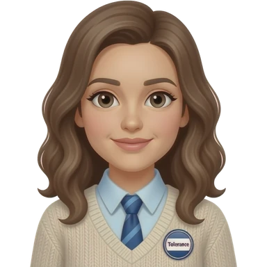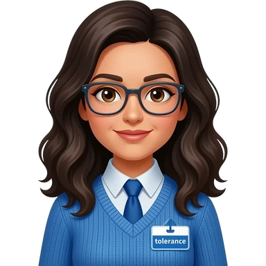 make someone who u think is abeer, blue tie, has a badge that says tolerance, wavy hair blackish brown and make her wear a blue pull over, brown eyes, and glasses emoji