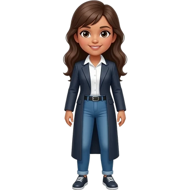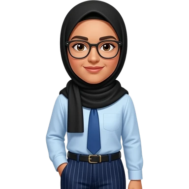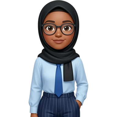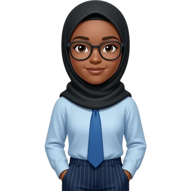 make someone who u think is aala, make her wear a black hijab, blue tie, wearing light blue shirt, dark blue pants with stripes, dark-ish skin , not too dark but not too light. and glasses emoji