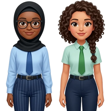 make someone who u think is aala, make her wear a black hijab, blue tie, wearing light blue shirt, dark blue pants with stripes, dark-ish skin , not too dark but not too light. and glasses and make her with another human called haneen( haneen has a green tie with curly tied braded hair) emoji