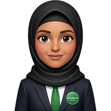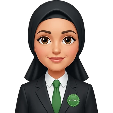 make someone whose name u think might be Alifna, make her wear a green tie, black hijab,, skin peach, make her wear a green colour badge with the this being written "wisdom" emoji
