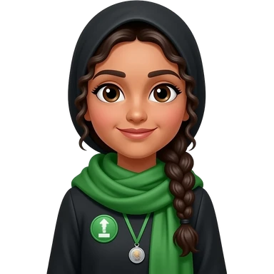 make someone whose name u think might be Alifna, make her wear a green scarf, black hijab,, skin normal indian skin, make her wear a green colour badge toobraided hair curly emoji