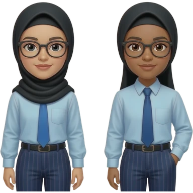 make someone who u think is aala, make her wear a black hijab, blue tie, wearing light blue shirt, dark blue pants with stripes, dark-ish skin , not too dark but not too light. and glasses and make her with another human called haneen emoji