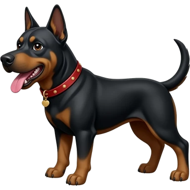 Generate a emoji of a big evil doberman dog with red eyes and a tongue sticking out, give the doberman a human body with a white shirt and baggy jeans, make the doberman have piercings emoji