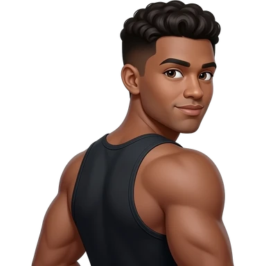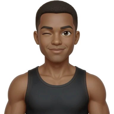 make a cute 20 year old man who’s skin is black wearing a black tank top with really good muscles and he is looking back at me winking snd his jawline is so sharp i can see it emoji