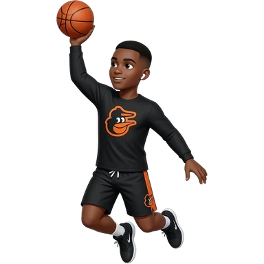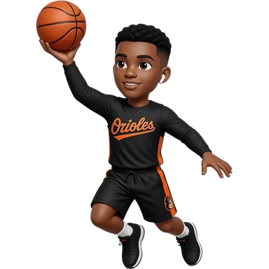 make a cute 20 year old man who’s skin color is black with a black low taper fade in black long sleeve with orioles in orange with the same for the shorts but on the side, the long sleeve should say orioles in the middle with white airpods in his ears and he is doing a fade away jumper with the 🏀 emoji