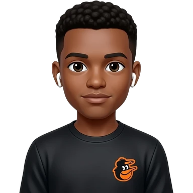 make a cute 20 year old man who’s skin is black wearing white color airpods in a black long sleeve that says orioles in orange emoji