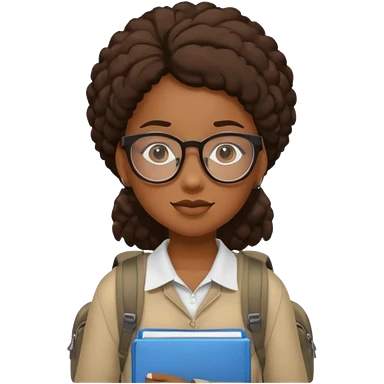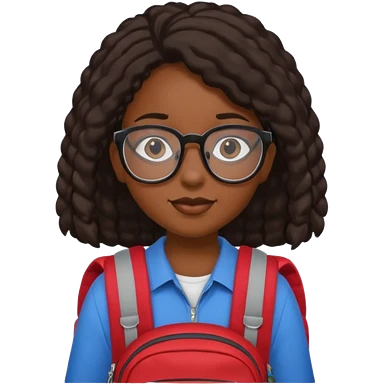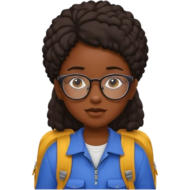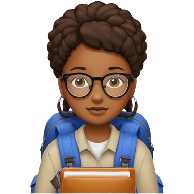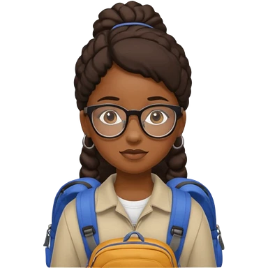 A 3D cartoon woman with a backpack smiling outdoors, surrounded by greenery, Memoji-style realism. emoji