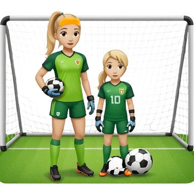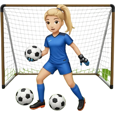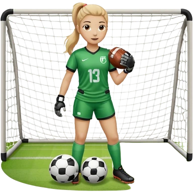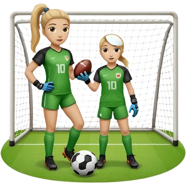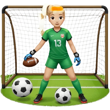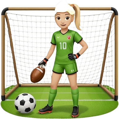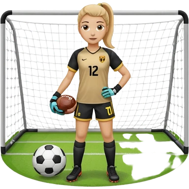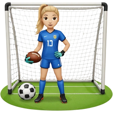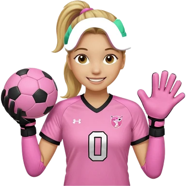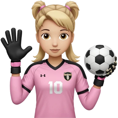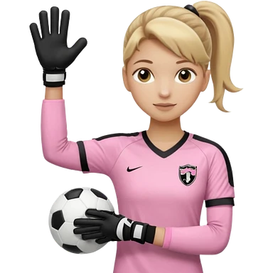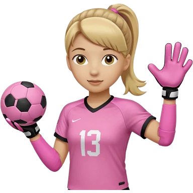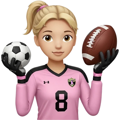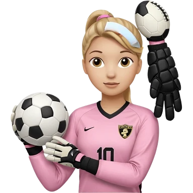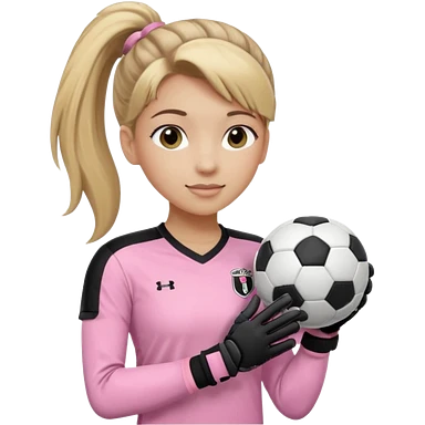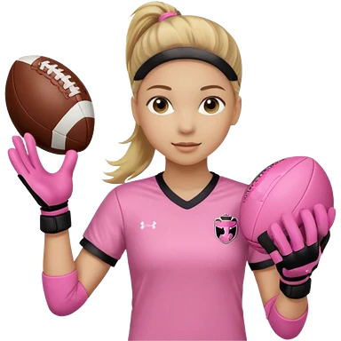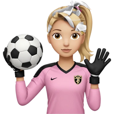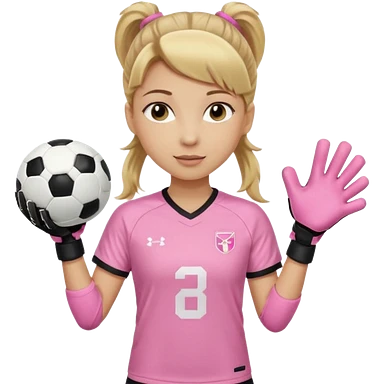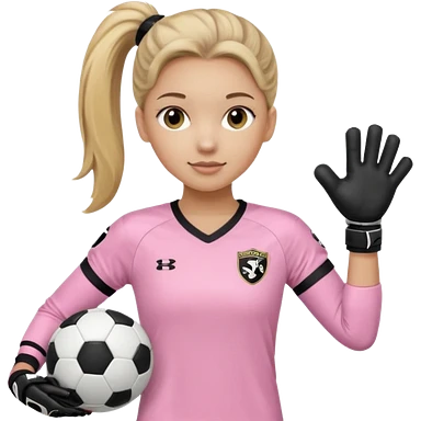 Make a dirty blonde football goalkeeper with goalkeeper gloves on. light skinned and wearing a light pink football kit. Wearing one ponytail on back of head. Make it without the whole body. With full sleeves. No RUGBY BALL JUST BLACK AND WHITE BALL. Holding ball under armpit. Other hand hanging downemoji