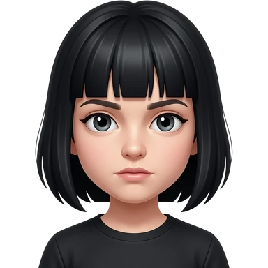 8 year old goth girl with black hair and bangs covering her eyes and with a serious mouth emoji