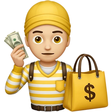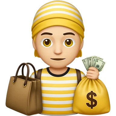 Make a yellow person with eye mask and black and white shirt and bag of money in his hand and a robber hat on emoji