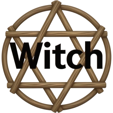 A Goth Victorian era inspired black text "Witch" . Behind the text is a brown rustic slightly crooked natural wood stick That make up an upwards pentagram. emoji