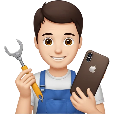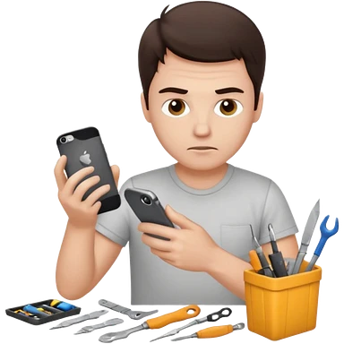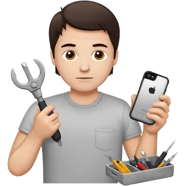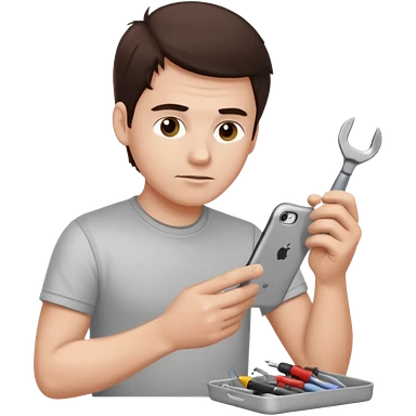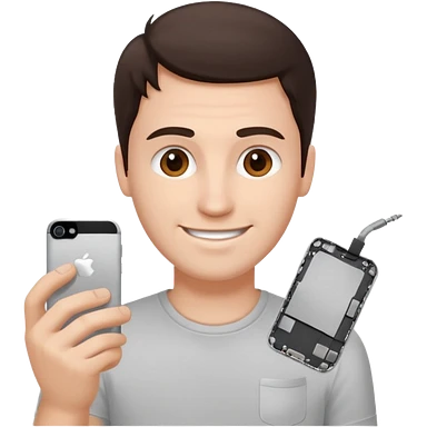 make a white guy with dark brown hair, with a simple white o grey shirt, repairing an iphone happy, tecnician with tools emoji | AI Emoji Generator