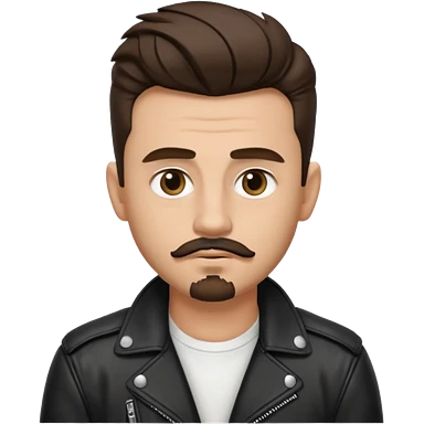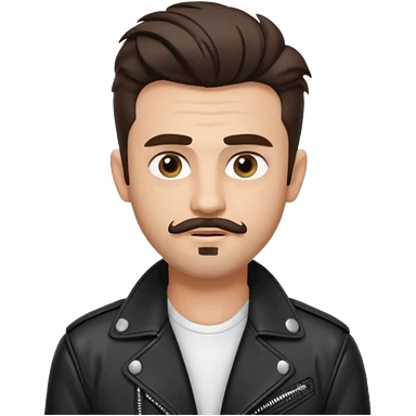 generate emoji style guy with slick James dean hair with front tendrils, mustache and goatee facial hair, wearing a white shirt and a black leather jacket , several silver piercings in ear, with dark brown hair and make eyes more almond shaped inspired by the image I shared emoji