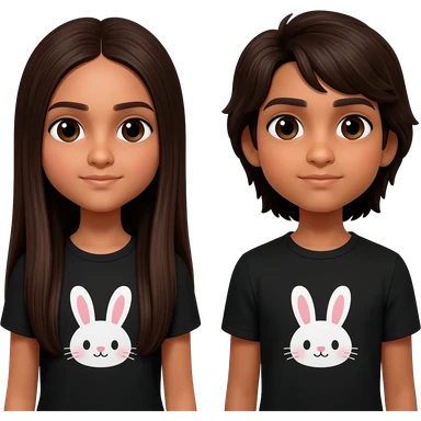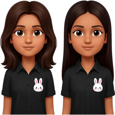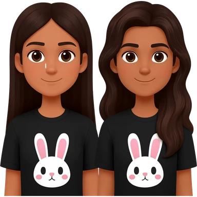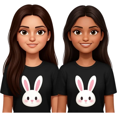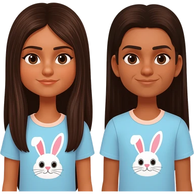 two identical friends with the emoji style. Both have matching bunny shirts and have PIN STRAIGHT HAIR One has super long dark brown hair that goes to waist, one has long hair that is also dark brown. They both have Indian skin emoji