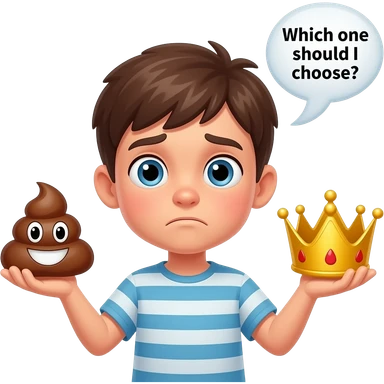 MAKE AN EMOJI AN BOY IN ONE HAND POOP IN ONE HAND CROWN . AND THINING WHICH ON ESHOULD HIM CHOOSE AND CONFUSING. MAKE HIM SAYIN WHICHONE HSOULD I CHOOSE . emoji