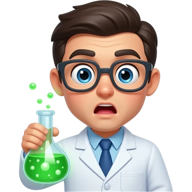 surprised scientist emoji, wide eyes, raised eyebrows, holding a glowing green chemical flask, lab coat, expressive face, cartoon style, clean emoji design, simple shapes, soft shading, centered composition, transparent background emoji