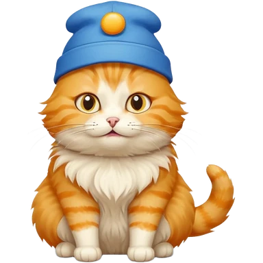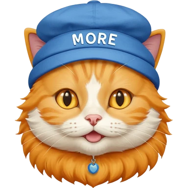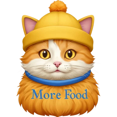 Make cat wearing cute hat that are yellow and has blue text that says More food!!! emoji | AI Emoji Generator