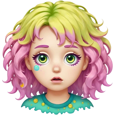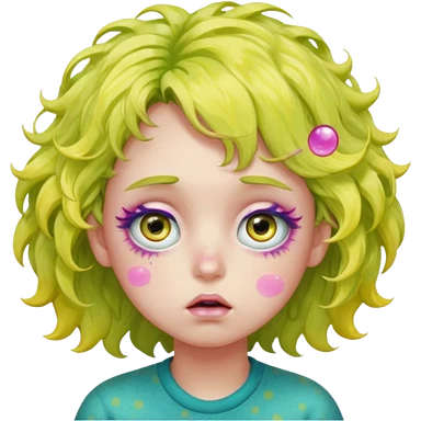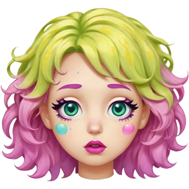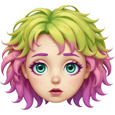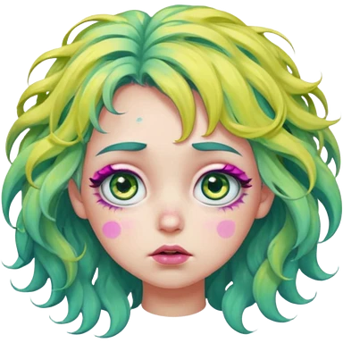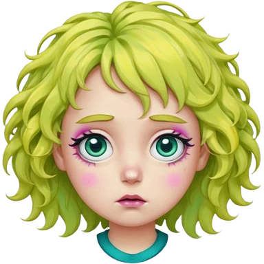 messy, wavy chartreuse hair, with pink specks, bushy eyelashes, and big round eyes, with irises that are teal on the outside and yellow on the inside while making a pouty face more light on the hair pls emoji