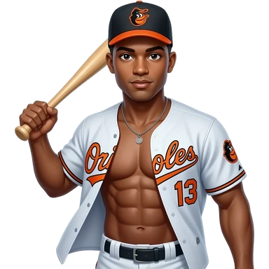 make a black skinned 20 year old man in a brown low taper fade wearing a baseball oriole jersey that is unbuttoned and you can see a lot of abs and big muscles and the jersey is orioles and an orioles hat and he is going up to bat ready to swing emoji