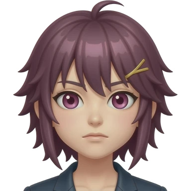 A female mage with peach-colored hair styled in two ox horn-shaped buns, purple eyes, fair skin, and a tsundere expression, wearing a form-fitting purple magical robe. emoji