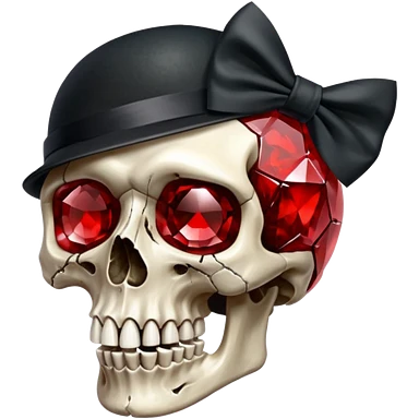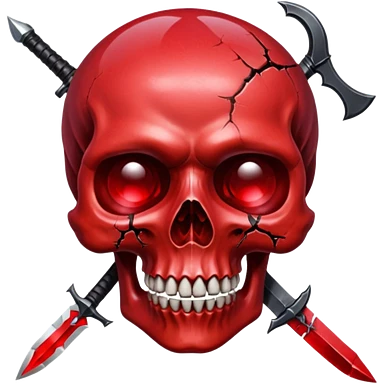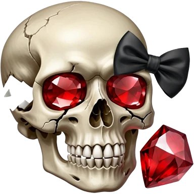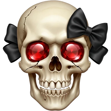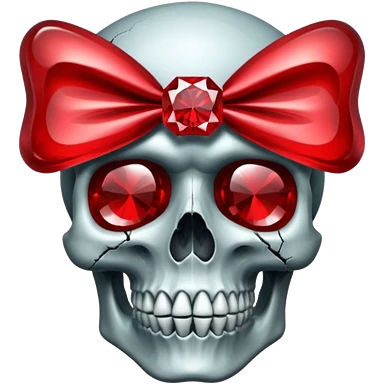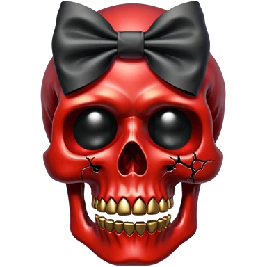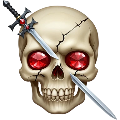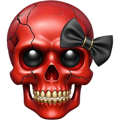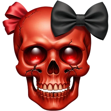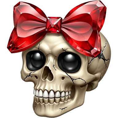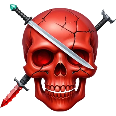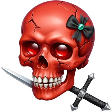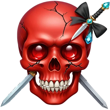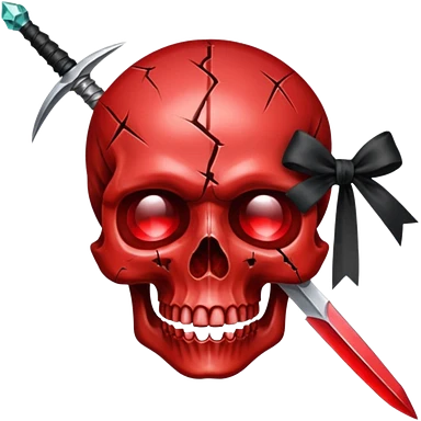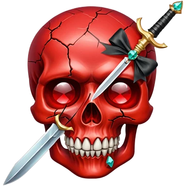 make me a red crystal skull partly see thew super gem like make it realistic and held together by a black bow and a small dagger to the eye with cracks coming from it have the bow be loosely tied around the skull holding it together make the blade super realistic emoji | AI Emoji Generator