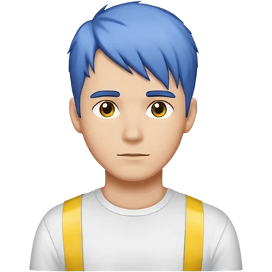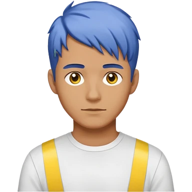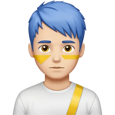 Make me an emoji that has a guy with a white shirt and yellow tape around the shirt with brown and blue hair emoji | AI Emoji Generator