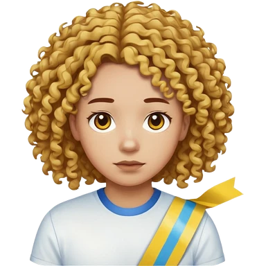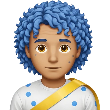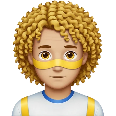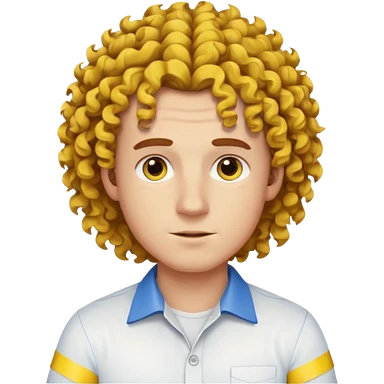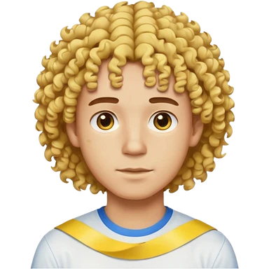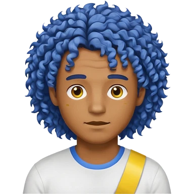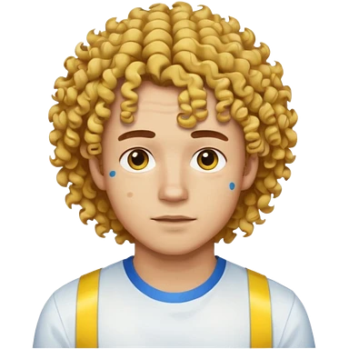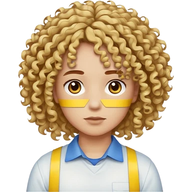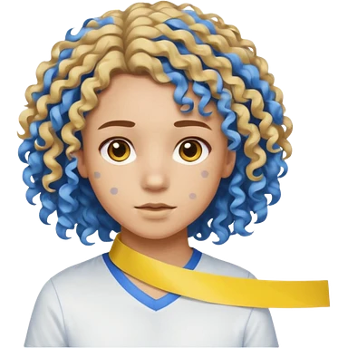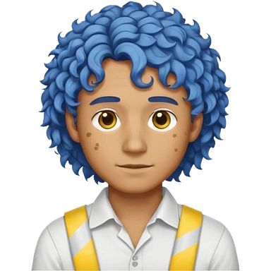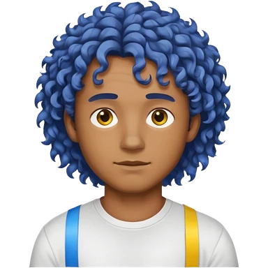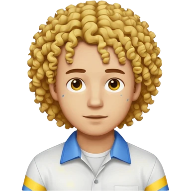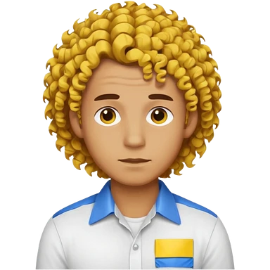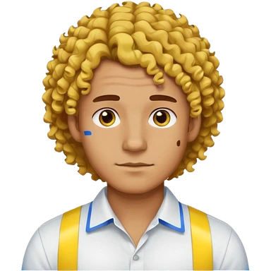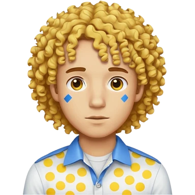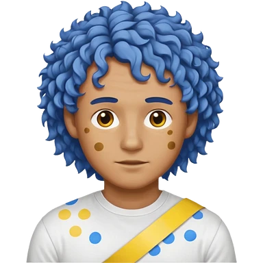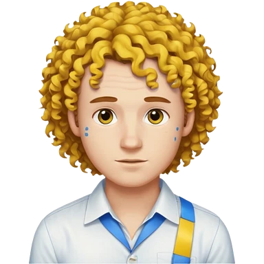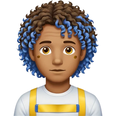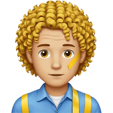 Make me an emoji that has a guy with a white shirt and yellow tape around the shirt with brown and blue spots hair make the hair curly emoji