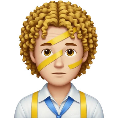Make me an emoji that has a guy with a white shirt and yellow tape around the shirt with brown and blue spots hair make the hair curly make the yellow tape go around it emoji