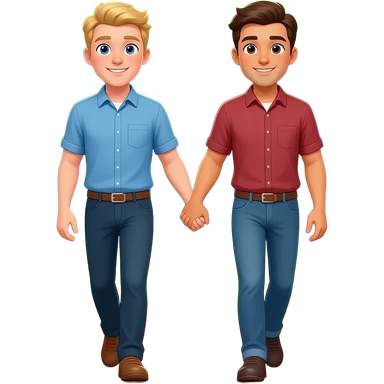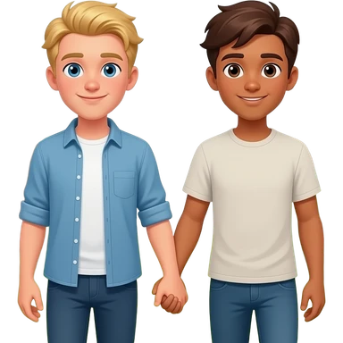Make a gay couple on a Date , one has light Skin with Blond Hair and Blue Eyes, the other one has slightly brown skin witz dark Brown Hair and Brown Eyes. They are walking through a forest and hold hand. emoji