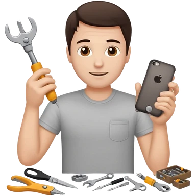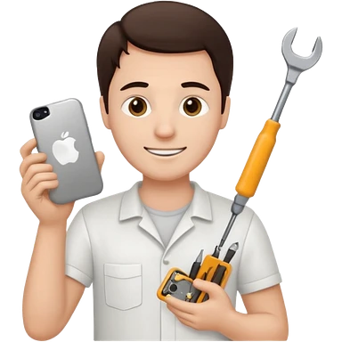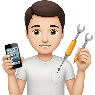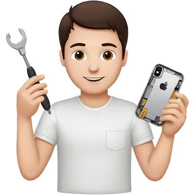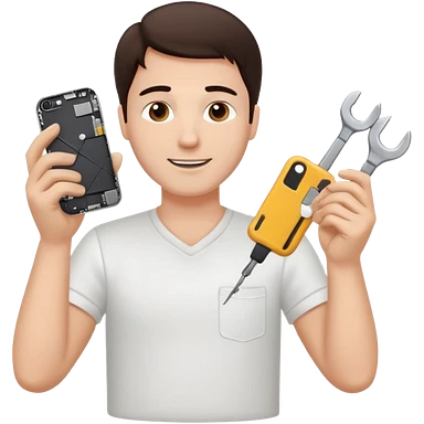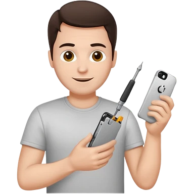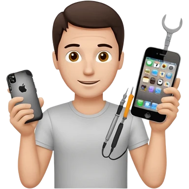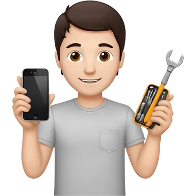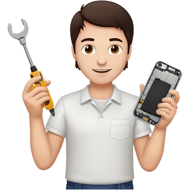 make a white guy with dark brown hair, with a simple white o grey shirt, repairing an iphone happy, tecnician with tools emoji