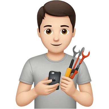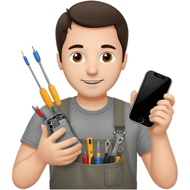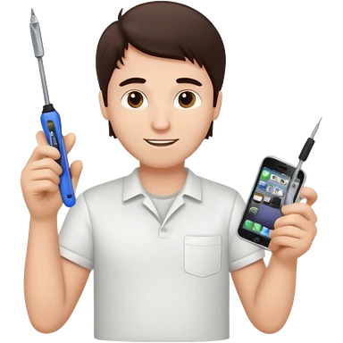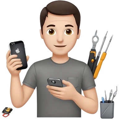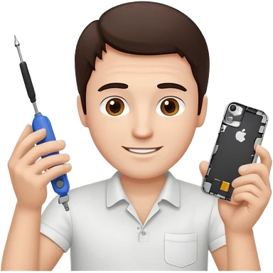 make a white guy with dark brown hair, with a simple white o grey shirt, repairing an iphone happy, tecnician with small real tools for phone emoji