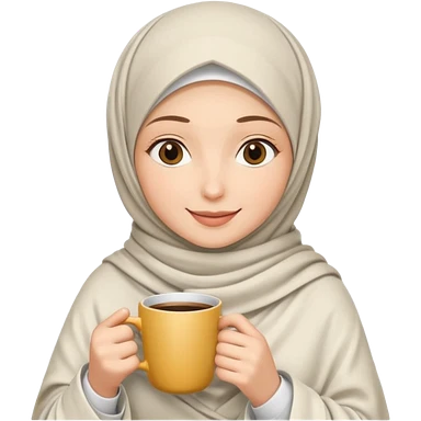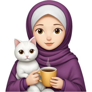 hijap bayan elinde kahve ve battaniyesi ve kucagında beyaz kedi emoji