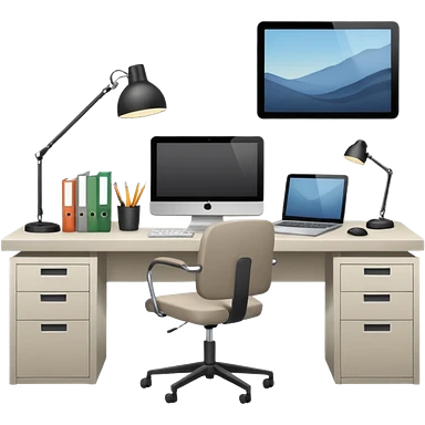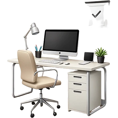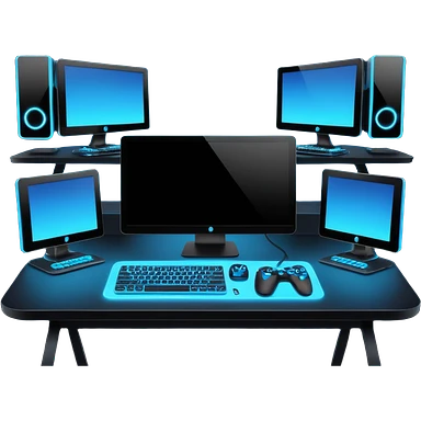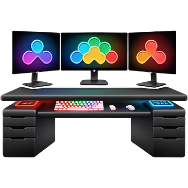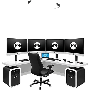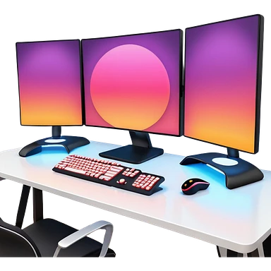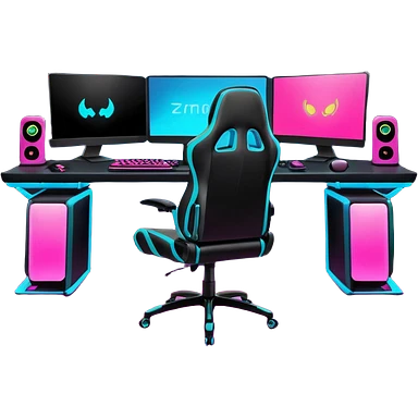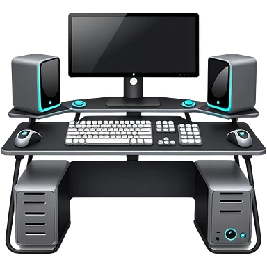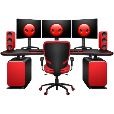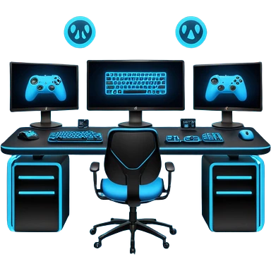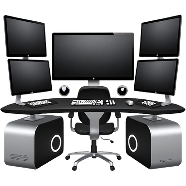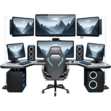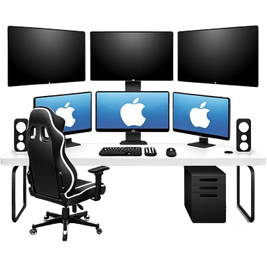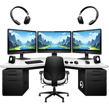 a setup of a youtuber, white skin, thin goatee, black short hair, with a desktop pc on a table, a gaming chair, microphone, no headset phone emoji