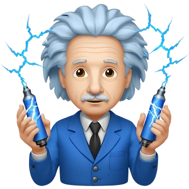 make albert einstein holding two tesla coils with lightning emoji