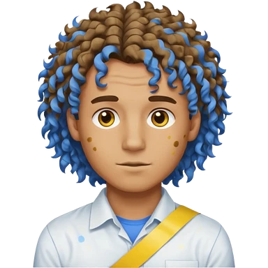 Make me an emoji that has a guy with a white shirt and yellow tape around the shirt with brown and blue spots hair make the hair curly emoji