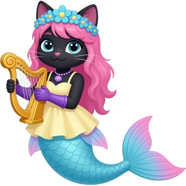 black anthro cat with pink hair blue flower crown with light purple shell necklace light yellow dress attached to long light blue mermaid tail with pink fins purple gloves holding a golden harp emoji