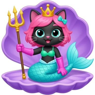 black anthro cat happy light blue mermaid tail with pink fins and long pink gloves pink hair golden crown green swimsuit sitting on an open purple clam holding a trident artistic creation, beautiful art emoji