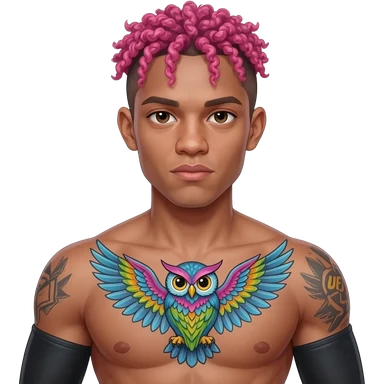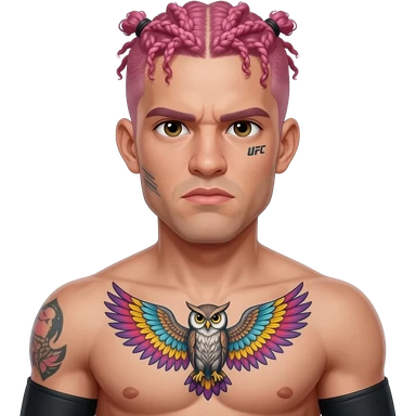 A skinny UFC fighter with curly short pink hair in braids with small face tattoos and a colorful owl tattoo with its wings spread on his chest with arm sleeves emoji