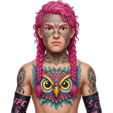 A skinny UFC fighter with curly longish pink hair in braids with face tattoos and a colorful owl tattoo on his chest with arm sleeves emoji