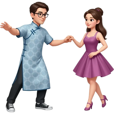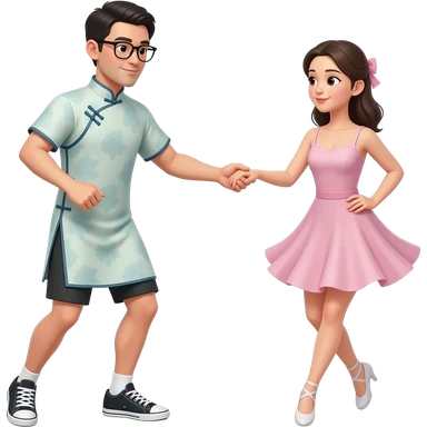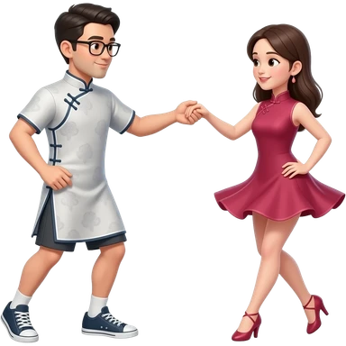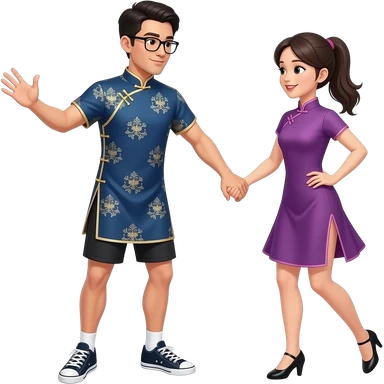 male with glasses in short cheongsam dress (no shorts) and dancing sneakers. show whole body profile with right hand outstretched to grasp a lady dancer's hand. emoji