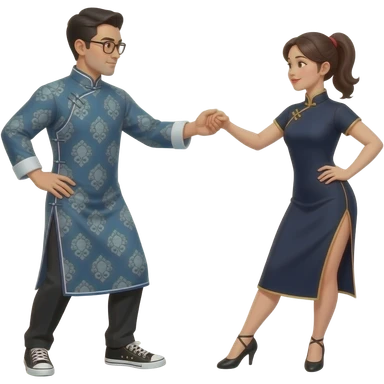 male with glasses in cheongsam dress (no shorts) and dancing sneakers. show whole body profile with right hand outstretched to grasp a lady dancer's hand. emoji