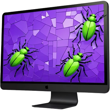 Broken computer screen with poxelated bugs. Color scheme is purple and limegreen emoji