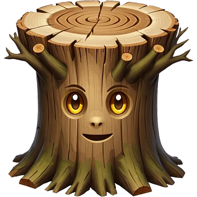 caricature of a smiling wooden log with big eyes, green leaves on the head, apple emoji style, white background, cute and colorful emoji