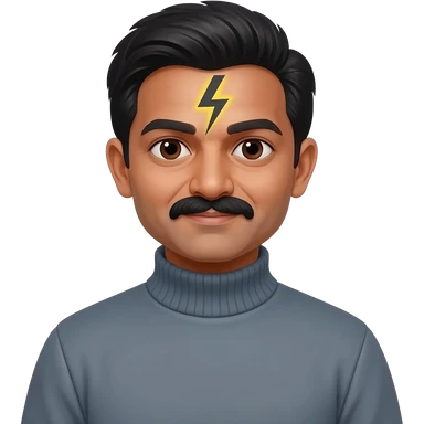 middle aged male indian primary school teacher without a moustache wearing a thick plain roller-neck jumper with a harry potter lightning forehead mark emoji