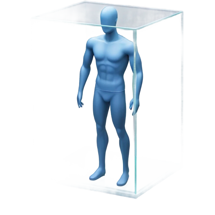 male mannequin abs cubes inside a glass cube on a stand isometric view emoji | AI Emoji Generator
