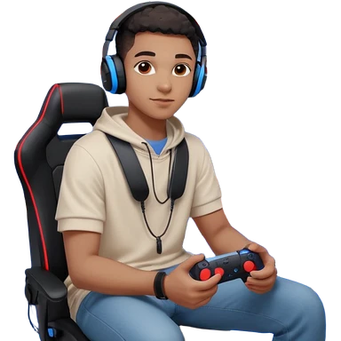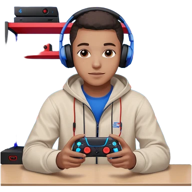 male memoji, man with messy hair, headphones, holding game controller, focused expression, sitting casual