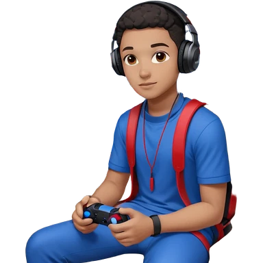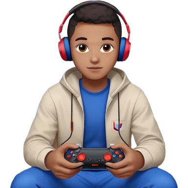 male memoji, man with messy hair, headphones, holding game controller, focused expression, sitting casual emoji | AI Emoji Generator