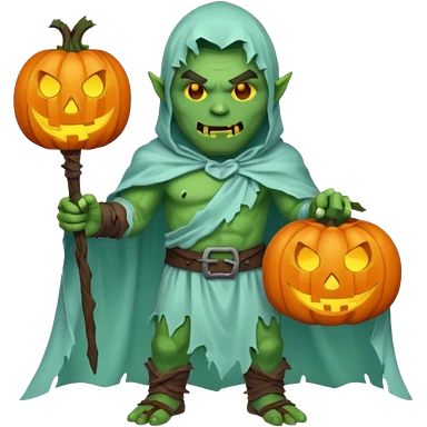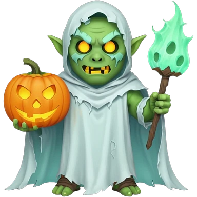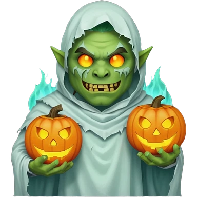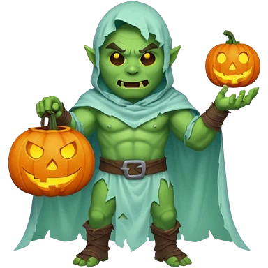 male orc warrior ghost emoji, green skin, wearing torn white ghost sheet costume, holding glowing jack-o'-lantern, faint blue aura, friendly but spooky expression, Halloween fantasy theme, Apple emoji style, clean white background, square emoji | AI Emoji Generator