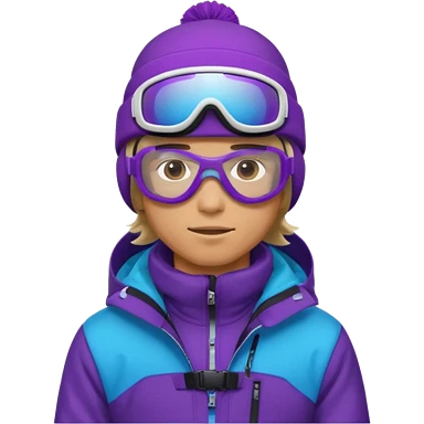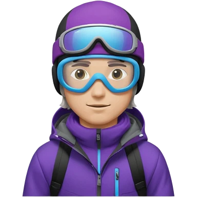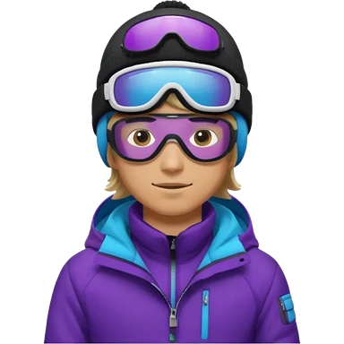 male Pro Snowboarder with white and grey beanie, ONE pair of purple and blue frameless goggles on and a black jacket emoji