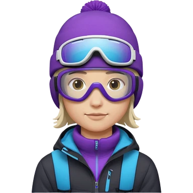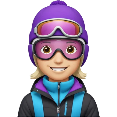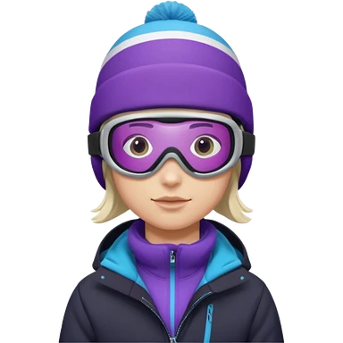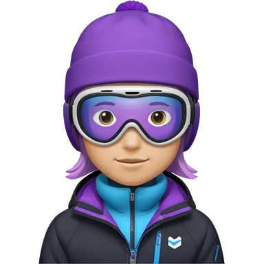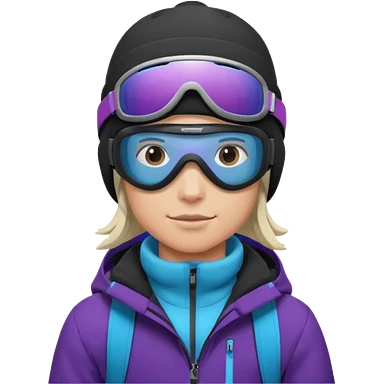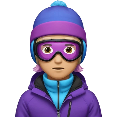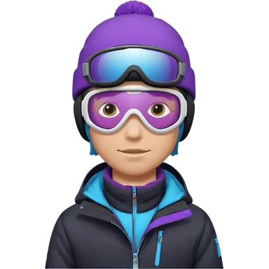 Pro Snowboarder with white and grey beanie, ONE pair of purple and blue frameless goggles on and a black jacket emoji